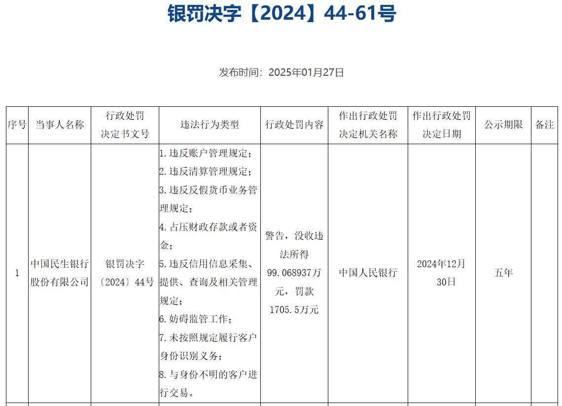贝多商业&贝多财经注意到,这并非民生银行今年首度收到千万级罚单。2025年刚开年不久,该行便收到了来自中国人民银行的警告,没收违法所得99万元,罚款1705.5万元,另有17名相关责任人被处罚。