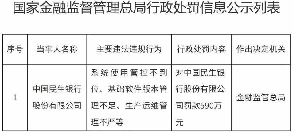 2025年9月,民生银行大额罚单风波再起,短短半月内便收到两张百万级罚单。其中,该行因系统使用管控不到位、基础软件版本管理不足、生产运维管理不严等,被国家金融监管总局罚款590万元。