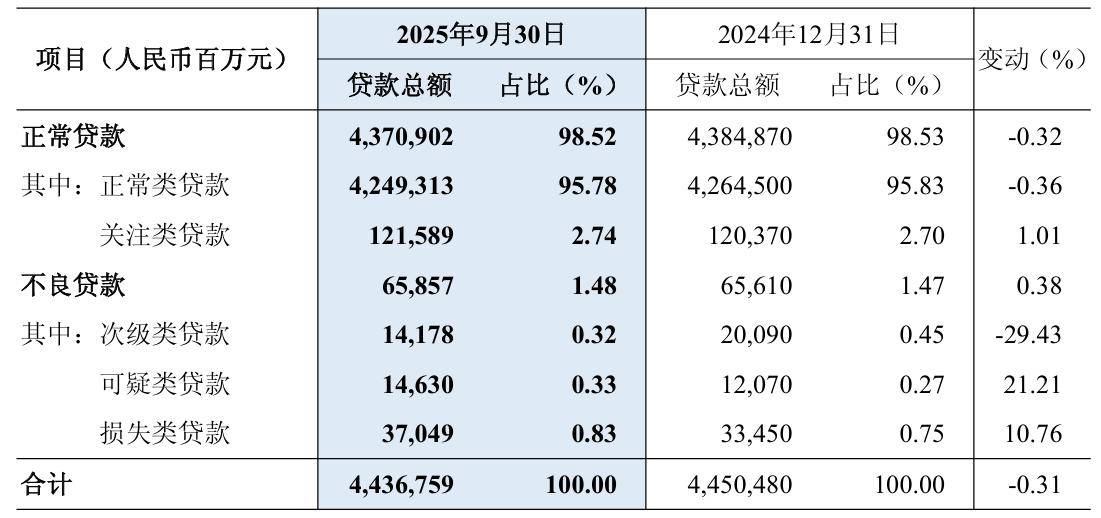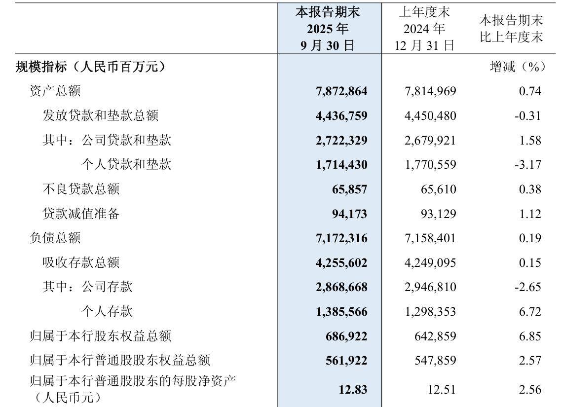 需重点关注的是,民生银行的总资产已陷入原地踏步的困境,该行截至2025年9月末的资产总额为7.87万亿元,较上年末的增幅仅0.74%;发放贷款和垫款总额减少约137.21亿元,其中个人贷款和垫款总额较上年末减少3.17个百分点。