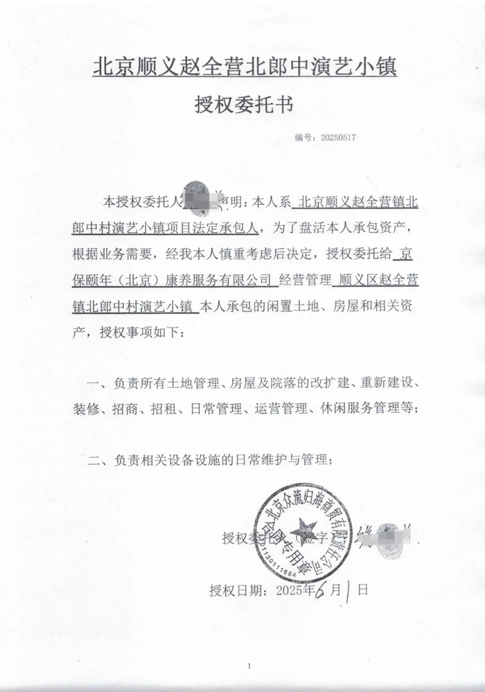 仅2个多月后,2025年6月1日,众流归海便以年租金240万元的价格,将演艺小镇转租给京保颐年,用于开办康养公寓,并签订《房屋租赁合同》及《授权委托书》,授权京保颐年“全权负责土地管理、房屋改扩建、装修、招商运营等事宜”。
