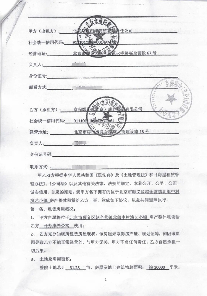 京保颐年用于开办康养公寓的承租合同(受访者供图)