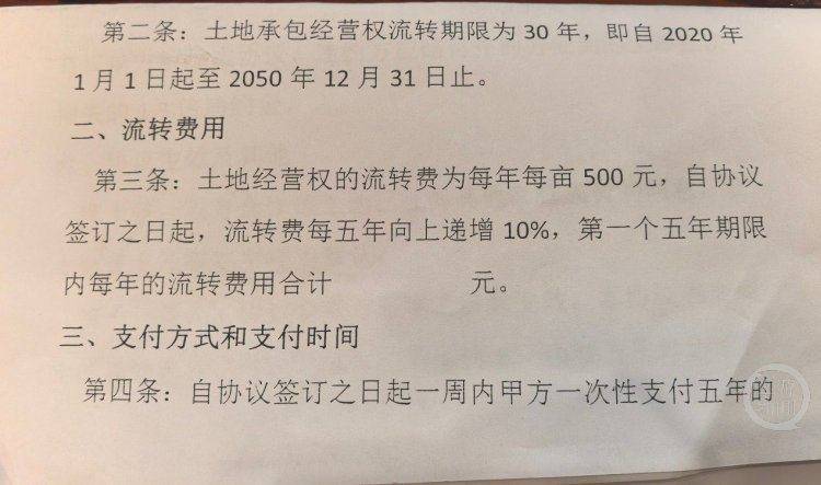 土地流转协议显示,土地承包经营权流转期限为30年,即自2020年1月1日起至2050年12月31日止。土地经营权的流转费为每年每亩500元,自协议签订之日起,流转费每5年向上递增10%。流转期内,村民继续享有国家给予的有关耕地补贴政策。流转协议上的甲方是村委会,乙方是村民,鉴证方是村委会。