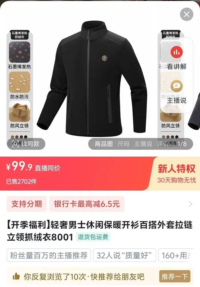 激情介绍完毕后,主播告诉屏幕前的网友,79元的价格就剩下一件了,要买的人需要抓紧抢购。“79元别说防寒的外套了,短袖都买不到。”主播说。些许时间,主播下达了下架指令:“来,下!下!下!”商品下架以后,主播又说“打出便宜的给70块的优惠”。一旁的工作人员说话间给他递上一个盒子,他打开一看,质问为何给的是冲锋衣。“我以为9块9卖的是短袖呢,怎么是冲锋衣,疯掉了。”实际上,这款9块9的冲锋衣仅仅挂了几秒钟的链接就下架了,直播间留言纷纷反馈,怎么抢也抢不到,最终显示“商品已卖完”。