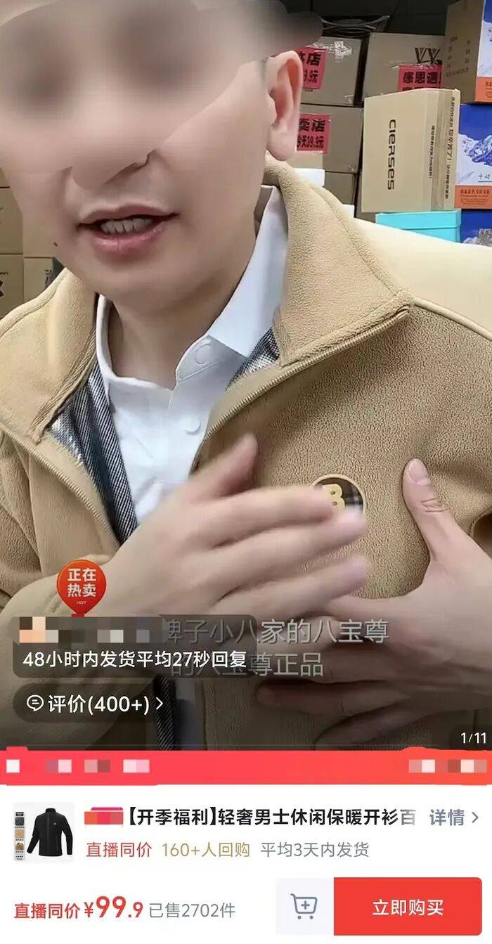直播间内,主播上架了一款品牌外套。对于这件外套他非常震惊:“还是巴宝品牌的,巴宝原装的袋子。”随后,主播展示了自己手上的衣服是“英国巴宝尊集团服饰”,太古汇广州专卖店,带“B”字的品牌衣服。他介绍称,很多明星身着的带“B”字衣服都是大牌子,一两千元一件。该主播展示了衣服上的温感logo和写着“官方正品全国联保”的吊牌。吊牌上写着“机场专供”和“6899元”的字样。让人不解的是,主播介绍的外套明明是棕色,但吊牌上颜色却写的是“black(黑色)”。该外套最初以899报价,在主播的几句话下,他手上这款的“专卖店”好货以99.9元购物车上车。一旁的助理听闻“震惊”地说:“料钱都不够。”