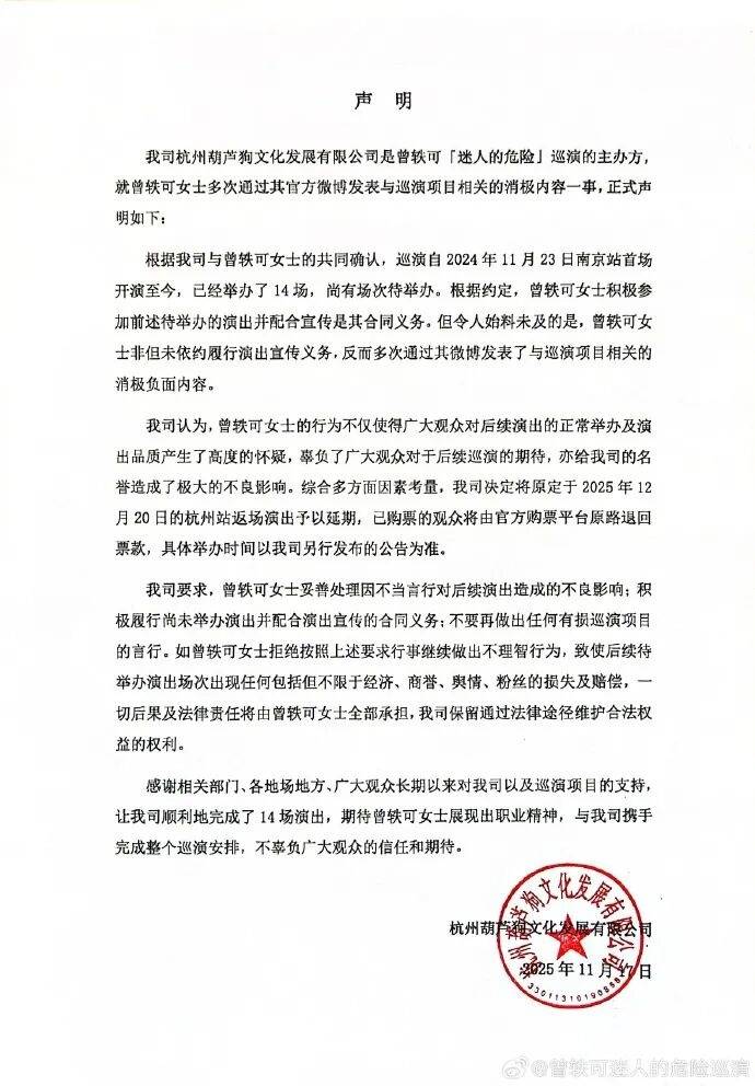 据扬子晚报消息,17日下午,曾轶可巡演主办方葫芦狗文化发展有限公司@曾轶可迷人的危险巡演 发表声明,指责曾轶可没有依约履行演出宣传义务,反而多次通过其微博发表了与巡演项目相关的消极负面内容。
