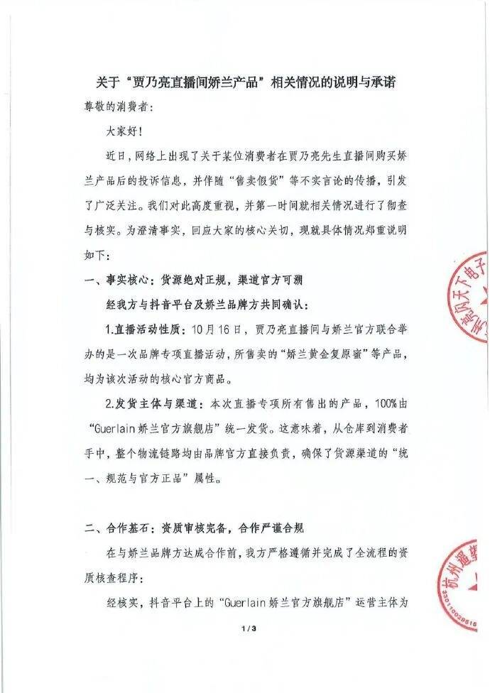 10月16日贾乃亮直播合作,所售的娇兰商品均由娇兰官方仓库直接发货,且抖音娇兰官方旗舰店为路威酩轩香水化妆品商贸(上海)有限公司合法合规的官方直营店铺,品质与售后均有品牌保障。收到消费者诉求后,我们随即与消费者进行沟通,诚邀消费者寄回商品以便品牌做进一步的专项调查,力求给消费者安心放心的购物体验。娇兰自1828年创立以来,始终坚守“以匠心铸就品质,以诚信服务用户”的核心理念,历经近两个世纪的沉淀与发展,消费者的信赖与体验始终是品牌前行的核心指引。感谢大家对品牌的支持与关注。