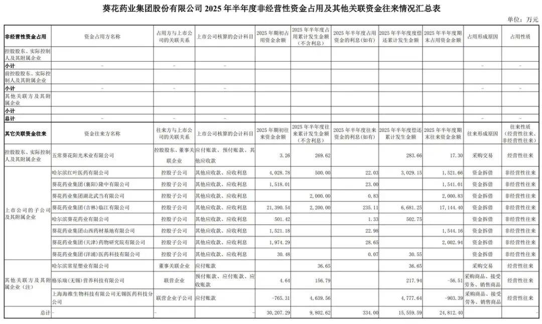 凤凰网财经《公司研究院》注意到,与相关公司的交易往来并未止步于2024年,2025年上半年仍在持续——葵花药业与格乐瑞因采购、销售商品及劳务往来产生156.79万元资金交易,期末尚欠对方56.5万元;与海维生物无锡医药科技分公司的经营往来更是高达4639.56万元,期末葵花药业尚欠对方903.39万元。
