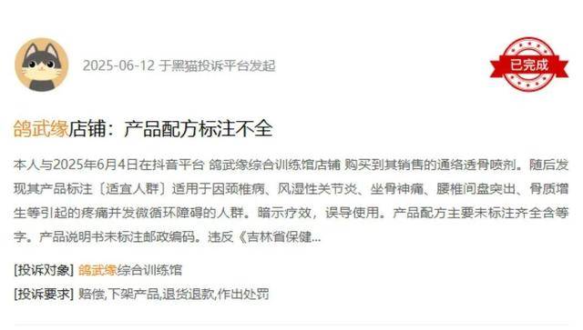 此外,另一款商品“通络透骨喷剂”也被消费者在“黑猫投诉”平台投诉。投诉内容指出,该产品说明书中列举了“颈椎病、风湿性关节炎、坐骨神经痛、腰椎间盘突出、骨质增生”等具体病症,涉嫌暗示产品具有治疗效果。