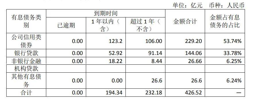 2024年临沂城投负债规模持续增长,负债结构由以非流动负债为主转为以流动负债为主。公司总负债619.17亿元,流动负债344.58亿元,非流动负债274.59亿元。有息债务为426.52亿元,同比上涨14.61%。公司信用类债券229.2亿元,银行贷款144.046亿元,非银行贷款26.66亿元,其他有息负债26.6亿元。一年内到期的有息负债为194.34亿元。并口径存续的公司信用类债券中,公司债券余额110亿元,企业债券余额0亿元,非金融企业债务融资工具余额119.2亿元,且共有75.2亿元公司信用类债券在2025年5至12月内到期或回售偿付。
