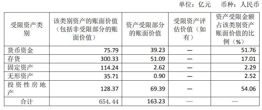 2024年公司受限资产163.23亿元,包括货币资金39.23亿元、存货51.09亿元、固定资产2.62亿元、无形资产0.9亿元、投资性房地产69.39亿元。受限资产占总资产的16.56%。