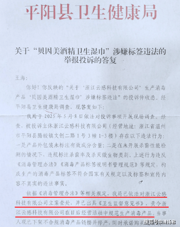 据行政处罚书(温平卫消罚﹝2025﹞2号)显示,浙江云感科技有限公司生产的“贝因美”75%酒精卫生湿巾因存在两项问题被罚:一是未标注杀菌成分含量,二是未经检测即宣称“99.9%杀菌”等。平阳县卫生健康局依法对其处以3000元罚款。