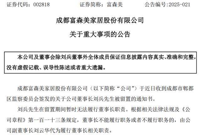 富森美表示,刘兵在留置期间暂时无法履行董事长职责。根据相关法律法规及《公司章程》第一百一十三条规定,董事长不能履行职务或者不履行职务的,由公司副董事长刘云华代为履行董事长相关职责。