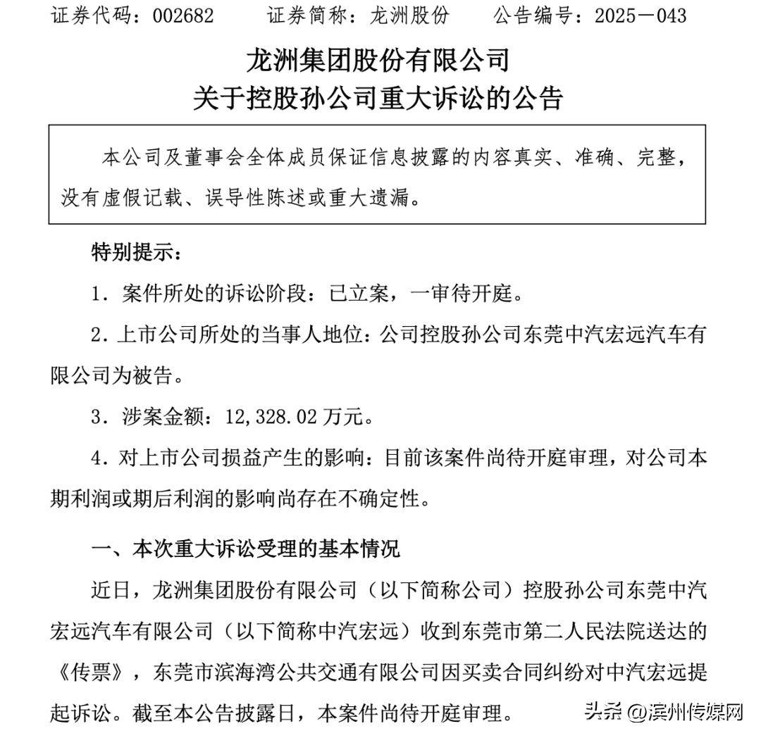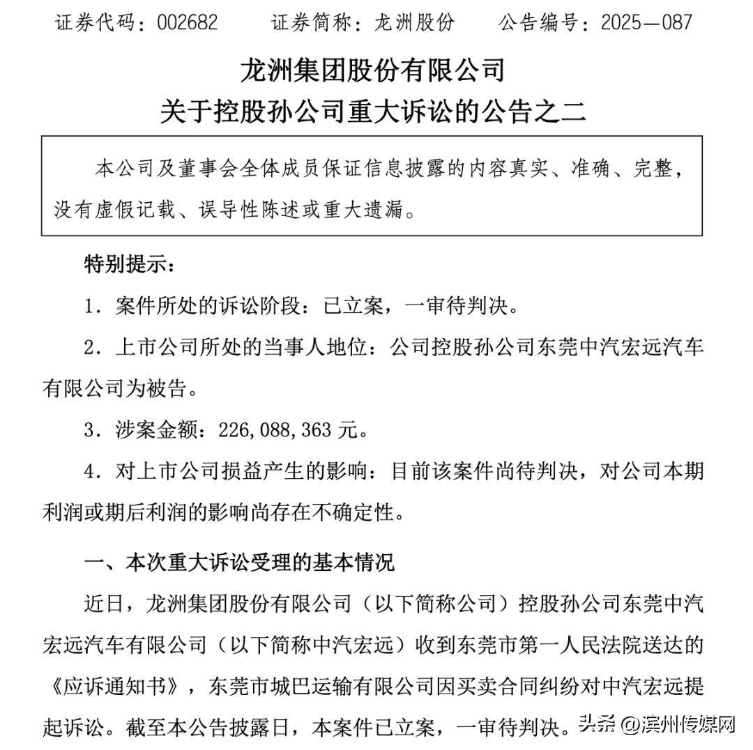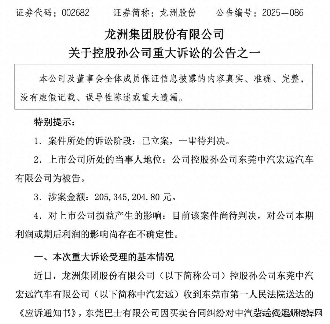 11月25日晚间,龙洲股份(002682)发布两则公告,披露其控股孙公司东莞中汽宏远汽车有限公司(下称“中汽宏远”)因买卖合同纠纷涉两起重大诉讼,案件均已由东莞市第一人民法院立案,目前处于一审待判决阶段。