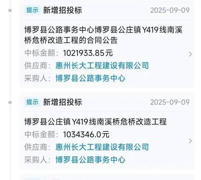 据了解,涉事项目为“博罗县公庄镇Y419线南溪桥危桥改造工程”,由博罗县公路事务中心于2025年8月进行招标,项目标的金额为103.43万元,合同约定工期为120天。涉事桥段尚处于施工初期阶段。