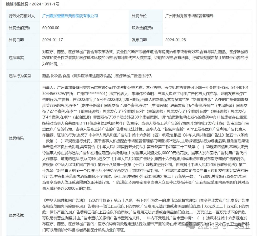 与壹加壹集团快速扩张相伴的,是其在各地频频出现的违规行为。广州市越秀区市场监督管理局于2024年1月份公布了一份行政处罚决定,揭露了广州壹加壹在2022年1月15日至2月28日期间,在新氧APP平台上的医院界面发布了111位患者信息和照片用于广告宣传。