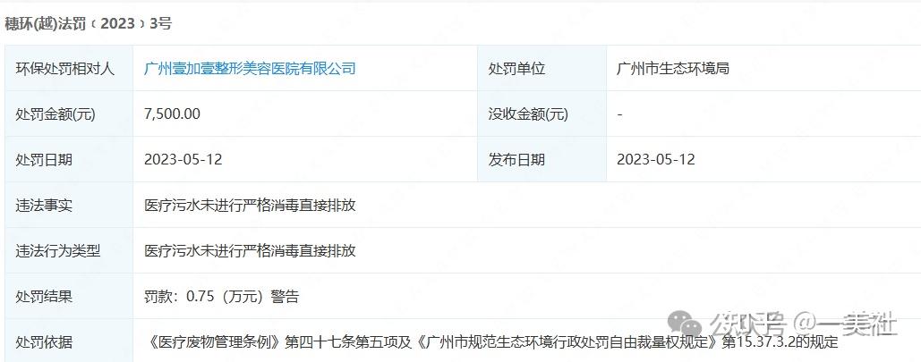 除了广告违法,广州壹加壹还在基础医疗安全规范上出现问题。2023年5月,广州壹加壹因医疗污水未进行严格消毒直接排放,被广州市生态环境局罚款0.75万元。这种基础性违规从另一个侧面反映了该机构在全面合规管理上的缺失。