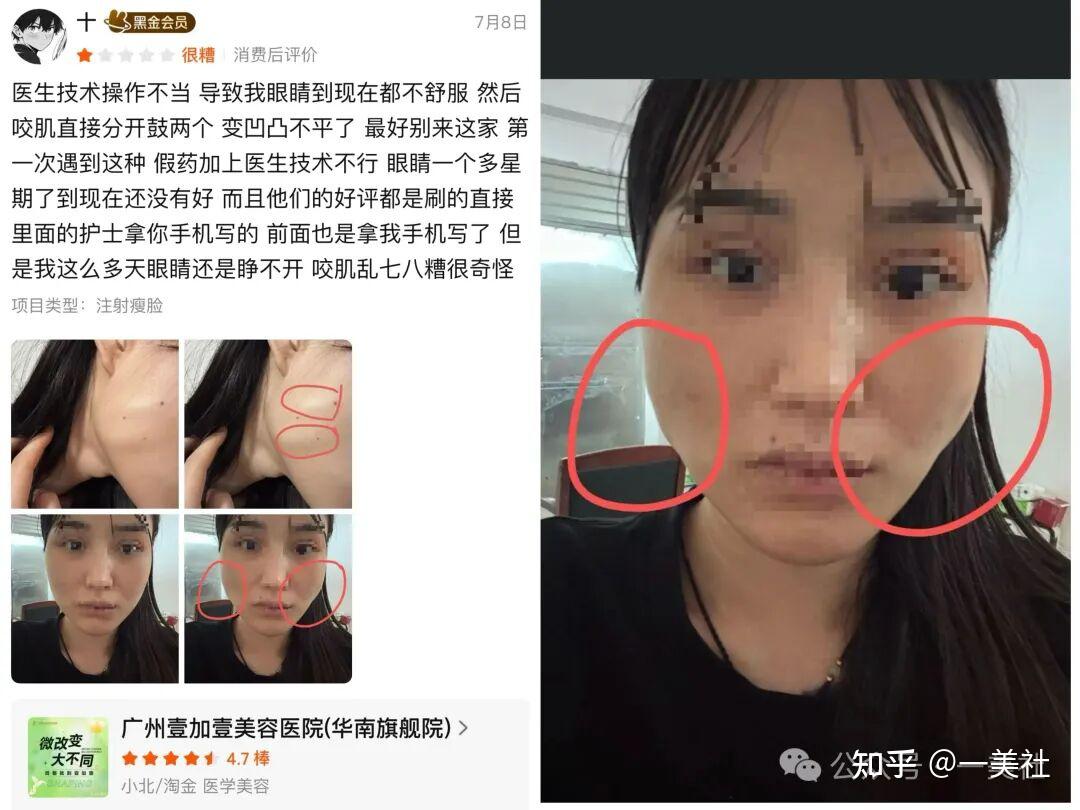 “医生技术操作不当,导致我眼睛到现在都不舒服,咬肌直接分开鼓两个,变凹凸不平了。”一位消费者在美团平台上对广州壹加壹美容医院抱怨道。她并非唯一的投诉者。
