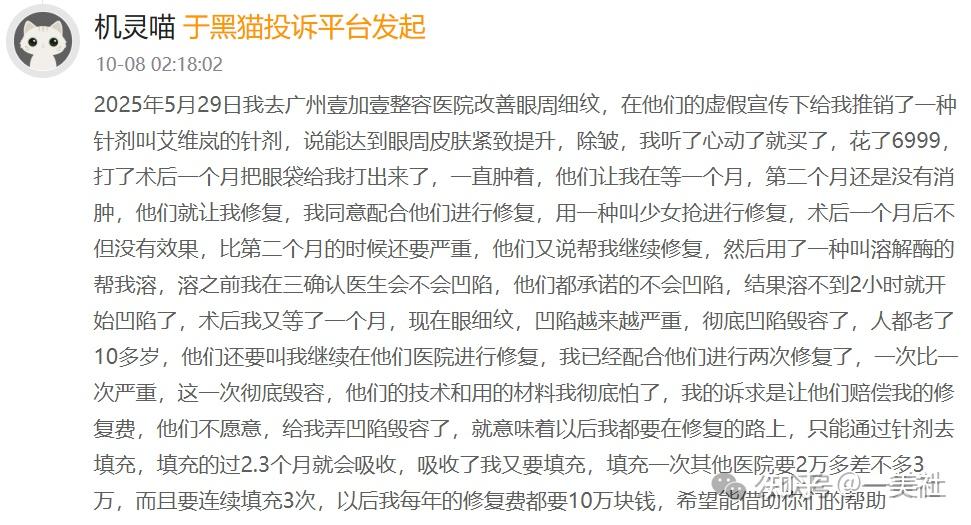 黑猫投诉平台显示,2025年5月29日,一名消费者前往广州壹加壹改善眼周细纹,在医院人员“虚假宣传”下,花费6999元购买了艾维岚针剂。“术后一个月把眼袋给我打出来了,一直肿着。”消费者称,医院让其等待一个月,第二个月仍未消肿,便建议进行修复。