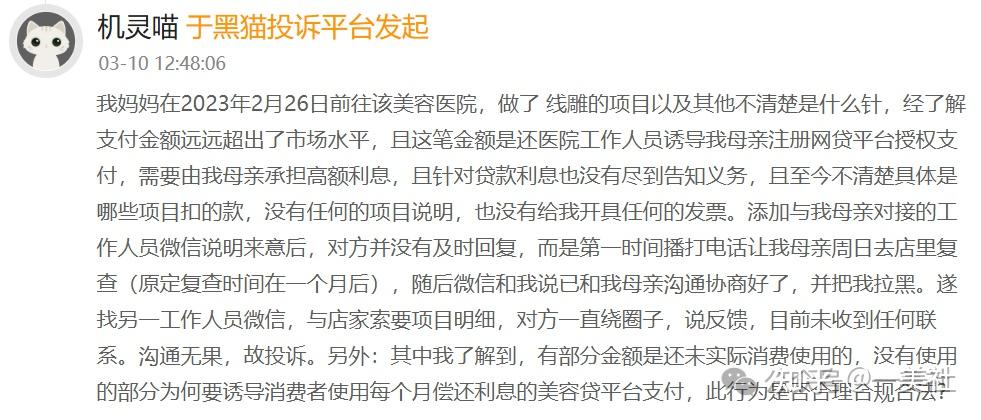 更令人担忧的是,广州壹加壹美容医院涉嫌诱导老年人贷款消费。一名消费者在黑猫投诉表示其母亲在2023年2月26日前往该院,做了线雕项目并注射了不明针剂。支付金额“远远超出了市场水平”,且是由“医院工作人员诱导我母亲注册网贷平台授权支付”,需要承担高额利息,而医院针对贷款利息也没有尽到告知义务。