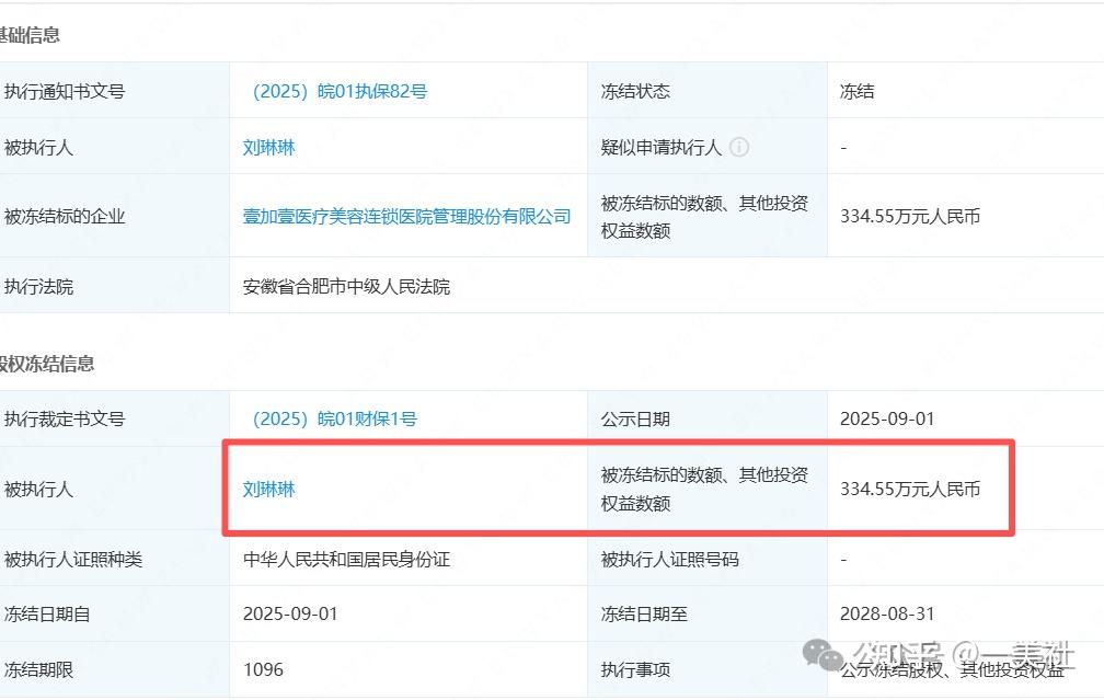 而更值得关注的是,这家号称由摩根士丹利旗下基金战略投资、在全国11座城市拥有13家机构的医美集团,其创始人刘琳琳所持有的部分公司股权、涉及数额334.54万元,已被冻结。
