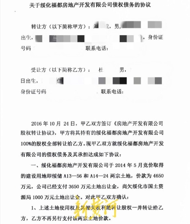 2017年12月,李某涛发觉此事后向绥化市公安局报案,控告刘某成职务侵占。“2018年2月,刘某成被绥化市公安局直属分局以涉嫌职务侵占罪刑拘,后绥化市北林区法院审理认为,刘某成案属于告诉才处理的案件(属于自诉案件的一个类型,编者注),裁定终止审理此案。”杜明告诉新黄河记者,刘某成和李某涛两人之间的个人纠纷,事情本身跟自己没有任何关系,“福都公司一开始就跟李某涛没有关联,拍地也是以公司名义拍的,我开始并不清楚李某涛出过钱。刘某成把整个公司和土地转让给我后,我把钱打给他,至于怎么分配就是他们之间的问题,是另外一种法律关系了。”