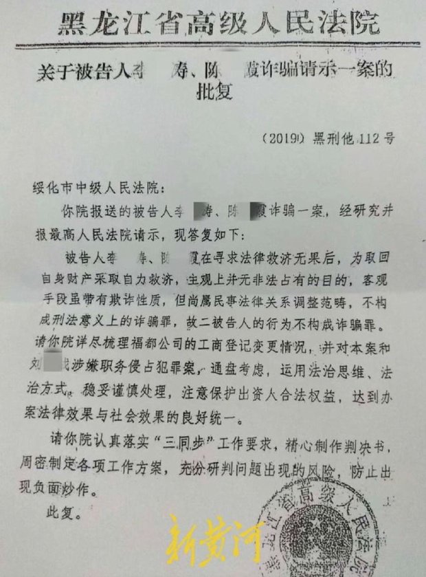 据福都公司相关工作人员提供的相关材料显示,2022年5月20日,黑龙江省高院向绥化市中院下达了一份“关于被告人李某涛、陈某霞诈骗请示一案的批复”函件。该函件显示:“被告人李某涛、陈某霞在寻求法律救济无果后,为取回自身财产采取自力救济,主观上并无非法占有的目的,客观手段虽带有欺诈性质,但尚属民事法律关系调整范畴,不构成刑法意义上的诈骗罪,故二被告人的行为不构成诈骗罪。请你院详尽梳理福都公司的工商登记变更情况,并对本案和刘某成涉嫌职务侵占犯罪案,通盘考虑,运用法治思维、法治方式,稳妥谨慎处理,注意保护出资人合法权益,达到办案法律效果与社会效果的良好统一。”