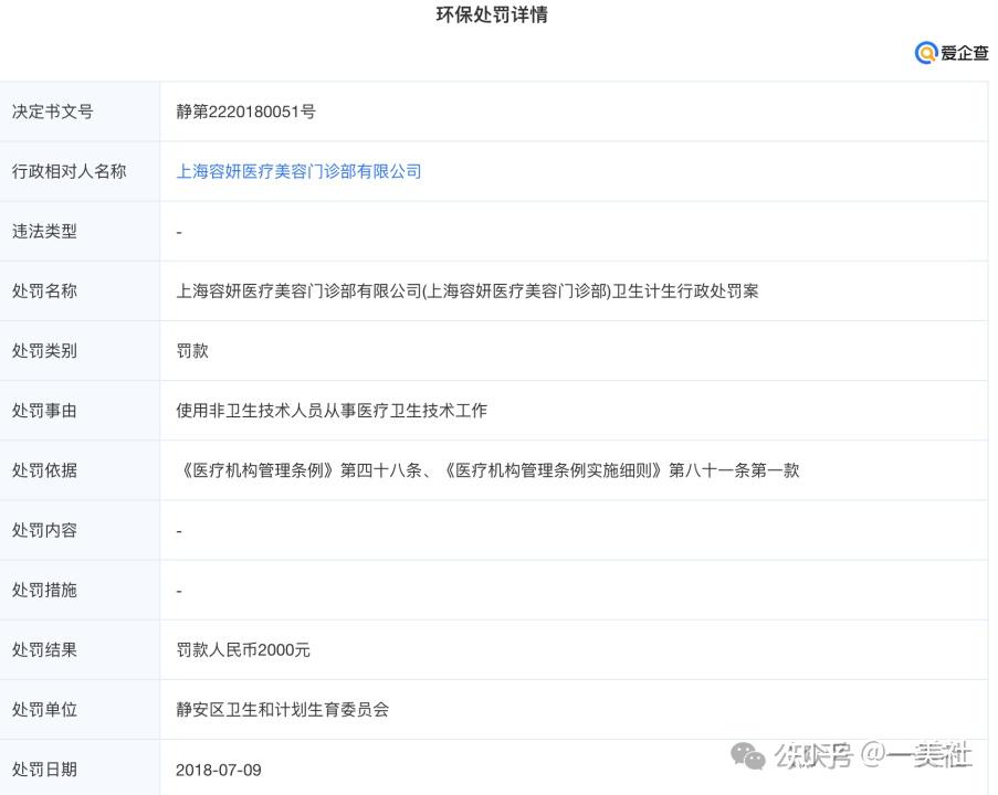 2018年7月9日,上海市静安区卫生和计划生育委员会对上海容妍作出罚款2000元的行政处罚,处罚事由是上海容妍医美“使用非卫生技术人员从事医疗卫生技术工作”,违反了《医疗机构管理条例》和《医疗机构管理条例实施细则》的相关规定。