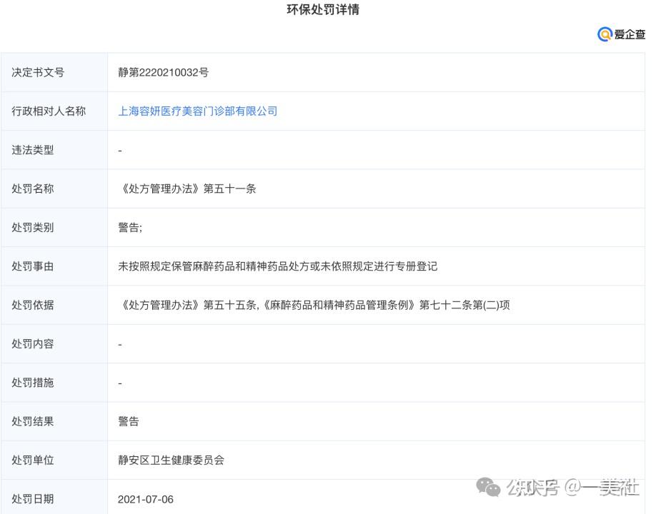 例如2021年7月6日,上海容妍医美因存在违反《处方管理办法》和《麻醉药品和精神药品管理条例》相关规定的行为,即“未按照规定保管麻醉药品和精神药品处方或未依照规定进行专册登记”,被上海市静安区卫生健康委员会处以警告的行政处罚。