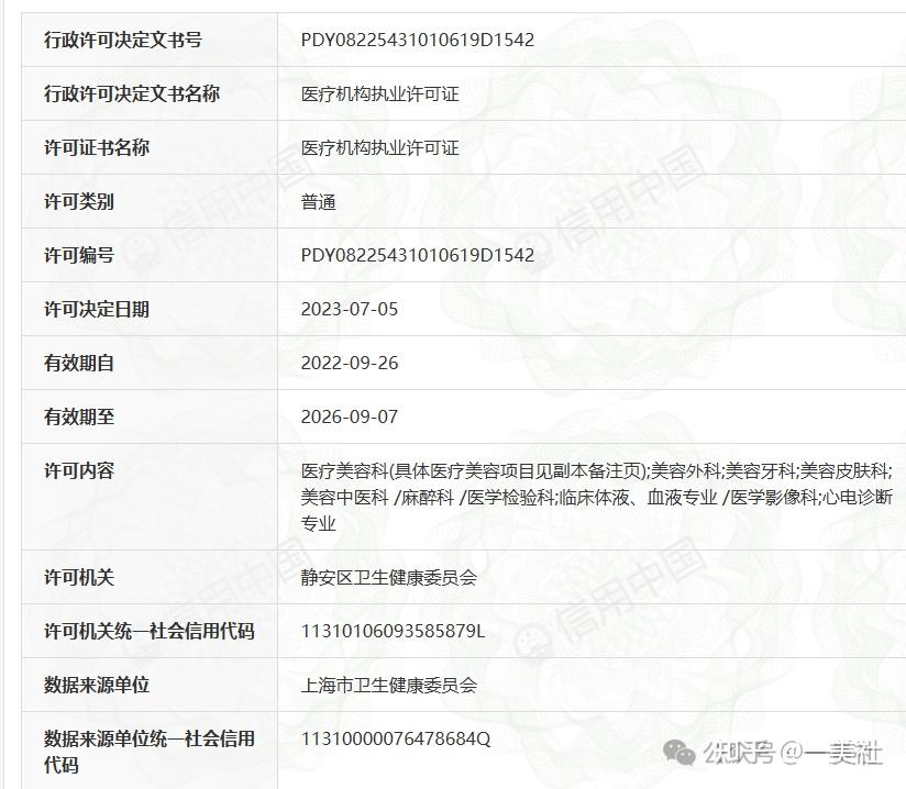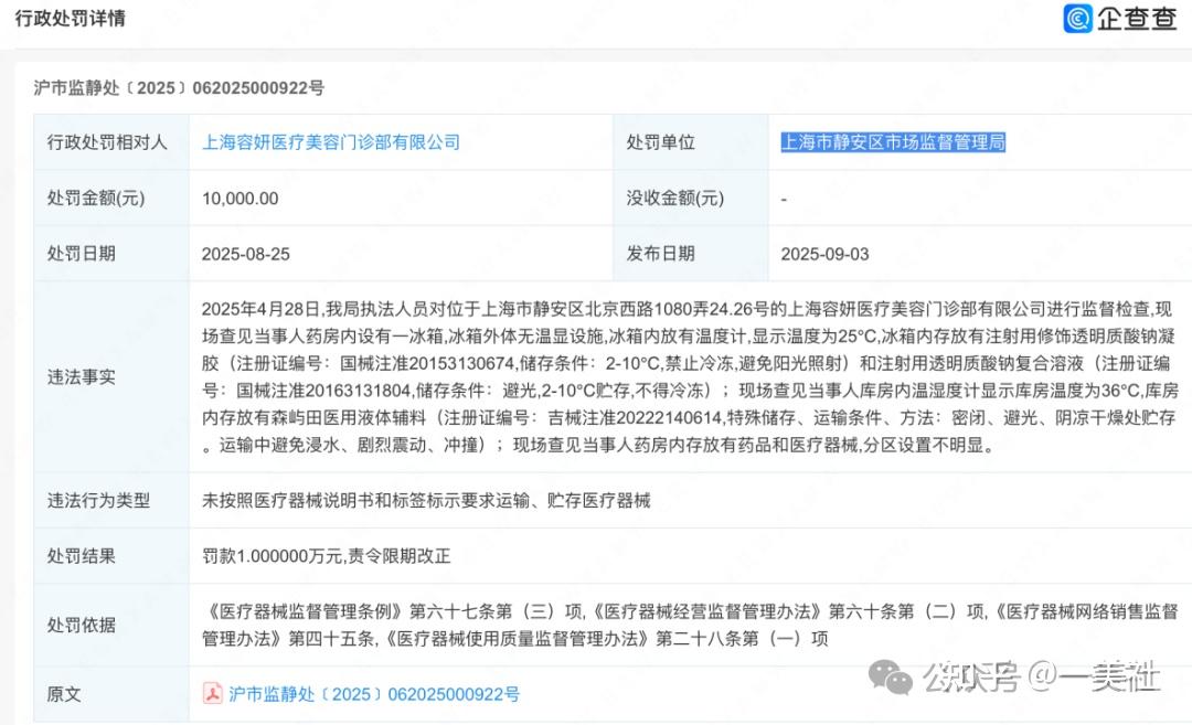 企查查显示,2025年8月25日,上海市静安区市场监督管理局对上海容妍医疗美容门诊部有限公司作出处罚。