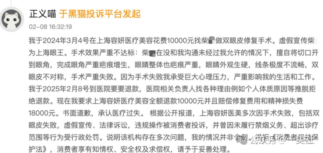 另有消费者在2024年3月4日到上海容妍医美花费1万元进行双眼皮修复手术,手术过程中医生柴某“在没和我沟通未经过我允许的情况下,擅自将切口开到眼角”,术后也出现一系列不良状况,“眼角严重疤痕增生,眼睛整体也疤痕严重,眼睛外观生硬,线条极度不流畅,双眼皮不对称,手术严重失败”。