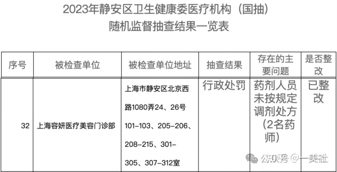 上海市静安区人民政府官网显示,在2023年静安区卫生健康委医疗机构(国抽)随机监督抽查结果中,上海容妍医疗美容门诊部因2名药师未按规定调剂处方受到行政处罚。