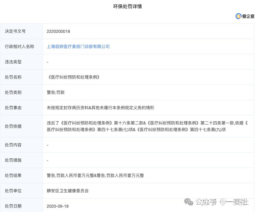 2020年9月18日,上海容妍医美因存在“未按规定封存病历资料以及其他未履行本条例规定义务的情形”的行为,违反了《医疗纠纷预防和处理条例》的相关规定,上海市静安区卫生健康委员依据《医疗纠纷预防和处理条例》第四十七条第(七)项和《医疗纠纷预防和处理条例》第四十七条第(九)项对其作出行政处罚,给予警告并处罚款人民币1万元。