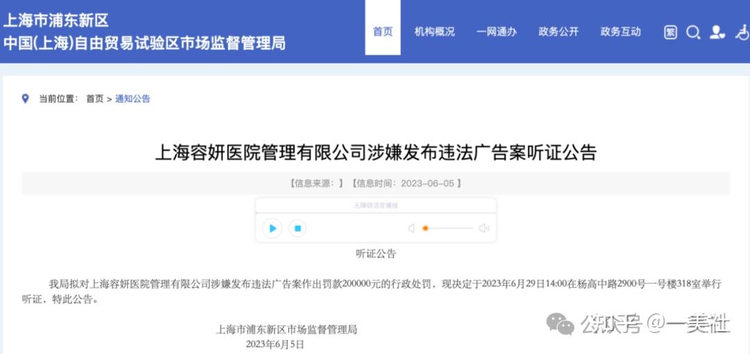 上海市浦东新区市场监督管理局官网显示,2023年6月5日,该局发布了《上海容妍医院管理有限公司涉嫌发布违法广告案听证公告》,公告提及“拟对上海容妍医院管理有限公司涉嫌发布违法广告案作出罚款20万元的行政处罚”。