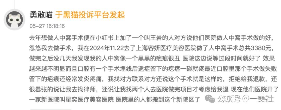 黑猫投诉平台显示,有消费者在小红书上加了一个名叫王岩的人,此人说上海容妍医美“做人中窝手术做的好”,后来该消费者在2024年11月22日到上海容妍花费3380元做了人中窝手术。