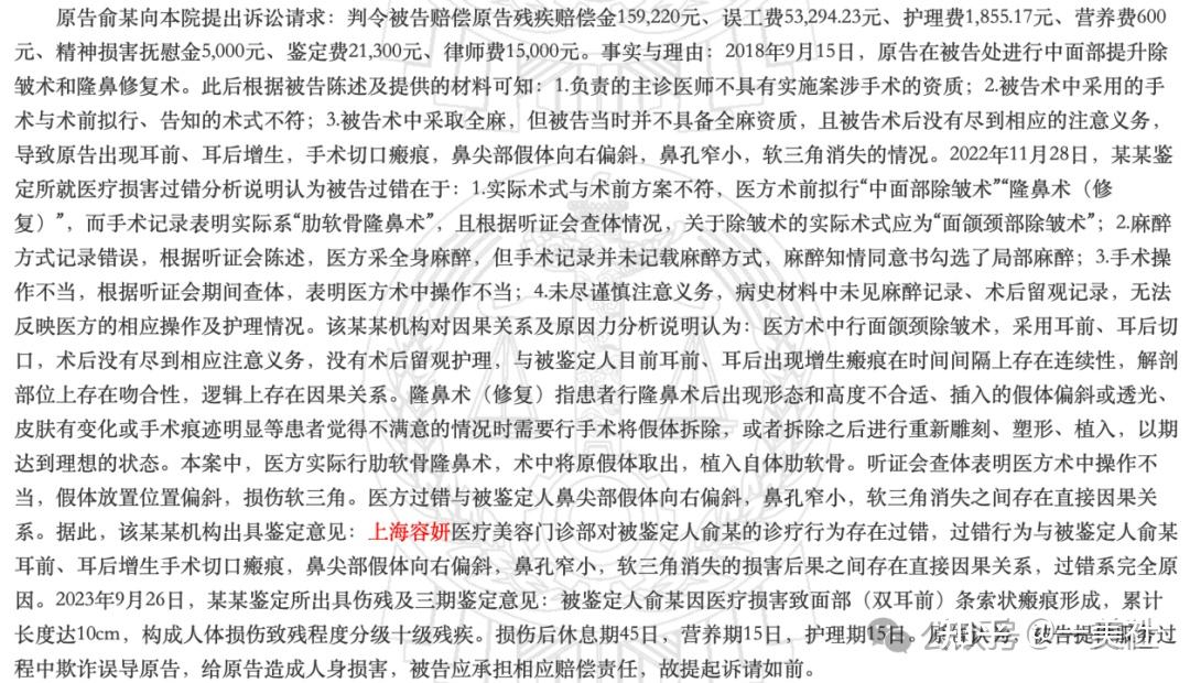 2018年9月,俞某在上海容妍接受中面部提升除皱术和隆鼻修复术,术后出现耳前、耳后增生及手术切口瘢痕,鼻尖部假体向右偏斜,鼻孔窄小,软三角消失等情况,经鉴定构成十级伤残。