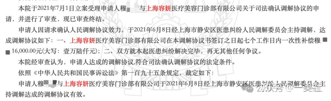 2021年6月8日,穆某与上海容妍医美之间的医患纠纷经上海市静安区医患纠纷人民调解委员会主持调解,已达成调解协议。协议内容提及上海容妍医美于协议签订之日起七个工作日内一次性补偿穆某16000元,双方医患纠纷解决完毕再无其他争议,间接确认了上海容妍需对该医患纠纷承担相应责任的事实。
