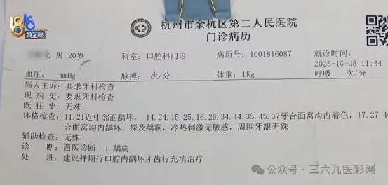 今年9月,门诊通知拆除钢丝和保持器,却有身边人反映孩子牙齿矫正效果不佳。周女士带儿子到其他医院检查,意外发现存在多颗蛀牙。9月6日,牙美佳口腔门诊说有6颗蛀牙;10月8日,周女士到杭州余杭区第二人民医院进一步检查确认下,检查结果显示其儿子共有17颗牙齿患有龋病。