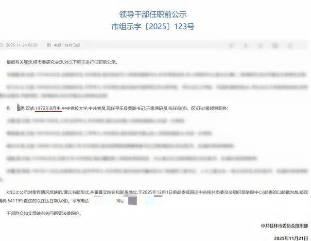 11月21日,桂林市委员会组织部发布了这则公示,显示其年龄为“1972年8月生目前正在公示期。记者注意到在2021年和2017年的相关任前公示中其年龄均显示为“1975年9月生”。