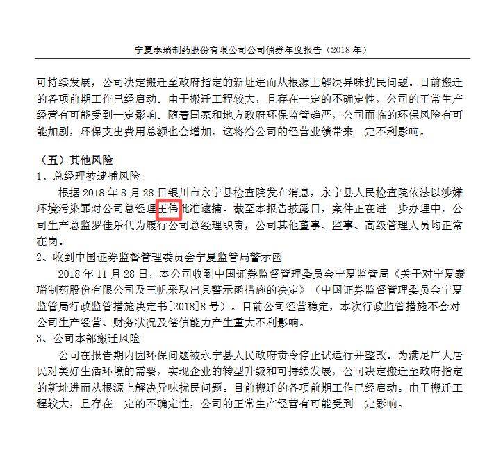 泰瑞制药并非A股上市公司,不负有上市公司式的信息披露义务,因此无法从公开渠道核实其是否曾发布过类似“董事长被刑拘”的正式公告。不过,根据公司在2018年对外披露的一份债券年度报告显示,当年8月,永宁县检察院曾以涉嫌环境污染罪对公司总经理王伟批准逮捕,随后法院开庭审理,但截至报告披露时尚未宣判。该报告未提及董事长被拘的信息。