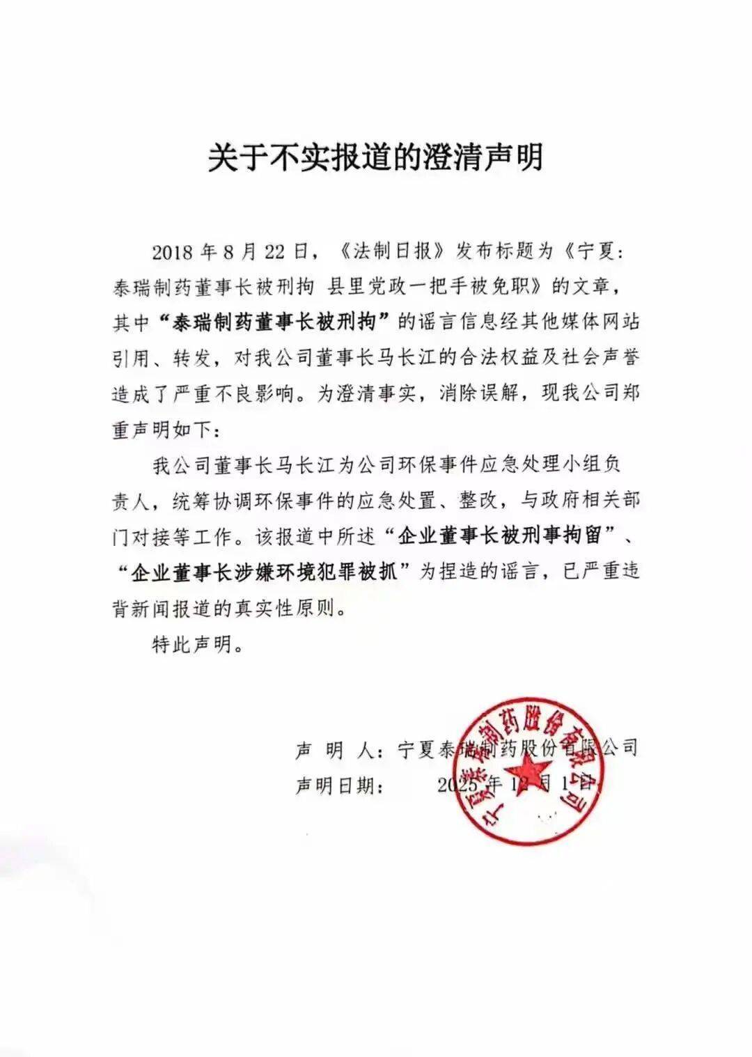 近日,一份盖有宁夏泰瑞制药股份有限公司公章的澄清声明在网络流传。传媒见闻注意到,这份声明直指《法制日报》(现《法治日报》)2018年8月刊发的《宁夏:泰瑞制药董事长被刑拘 县里党政一把手被免职》一文,称当年报道中关于“企业董事长被刑事拘留”“涉嫌环境犯罪被抓”等内容均为不实信息。