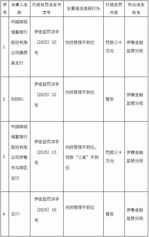 日前,国家金融监督管理总局伊春监管分局的一张罚单,将邮储银行三名员工推至台前——三人皆因“内控管理不到位”受罚。其中,杨某某为原邮储银行双兴镇支行员工,被禁业2年;闫某某和冯某某为原邮储银行伊春市乌翠区支行员工,分别被禁业3年和2年。