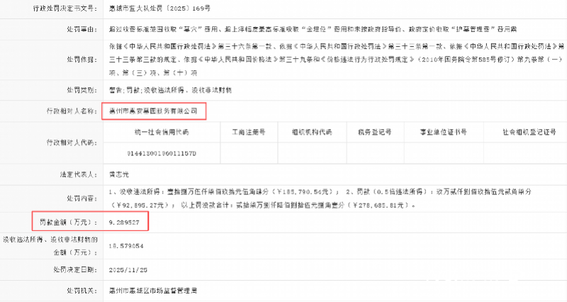 11月25日,惠州市惠安墓园服务有限公司因违规收费问题被行政处罚。惠城市监大队处罚〔2025〕169号处罚决定书显示,该公司存在超过收费标准收 “墓穴” 费、超上浮幅度收“金埕位”费、未按政府指导价收“护墓管理费”等行为,被没收违法所得约18.58万元,并处以约9.29万元罚款。