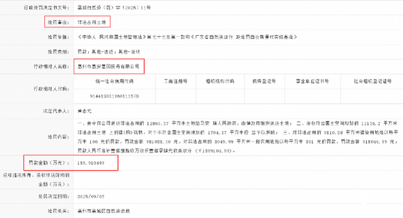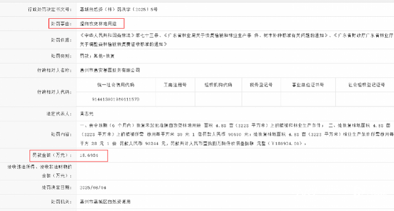 8月4日,惠州市惠安墓园服务有限公司因“擅自改变林地用途”,被惠州市惠城区自然资源局依法作出行政处罚。惠城自然资(林)罚决字〔2025〕5号处罚决定书显示,该公司未经批准改变4.83亩(3223 平方米)林地用途,被责令6个月内恢复植被及林业生产条件,同时被处以植被恢复费用、林业生产条件恢复费用对应的罚款,罚款金额合计18.6934万元。
