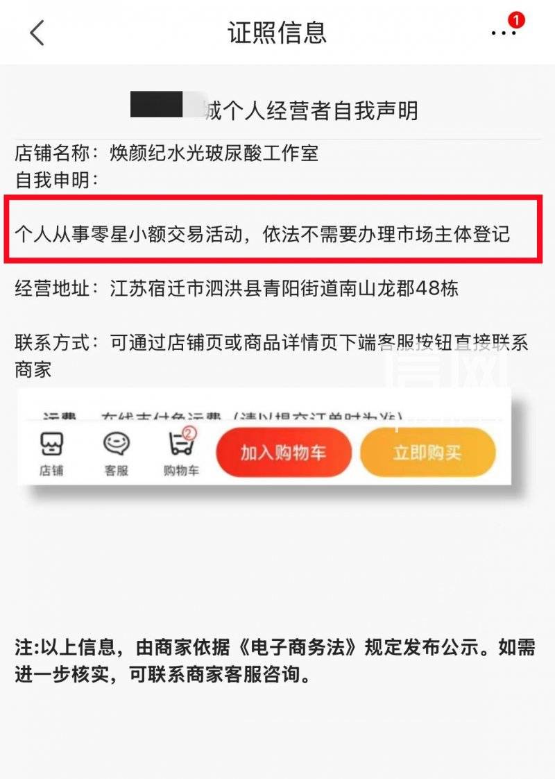 按照秦先生提供的线索,信号新闻打开了“焕颜纪”在电商平台上的店铺主页,发现多款带有“水光”字样的产品在售。根据《医疗器械网络销售质量管理规范》等规定,销售水光针一类产品,应该办理《医疗器械经营许可证》、《营业执照》等相关证件。而在该商家店铺,信号新闻并未找到任何上述证件信息,在“证照信息”一栏,有一则商家的自我声明——“个人从事零星小额交易活动,依法不需要办理市场主体登记。”