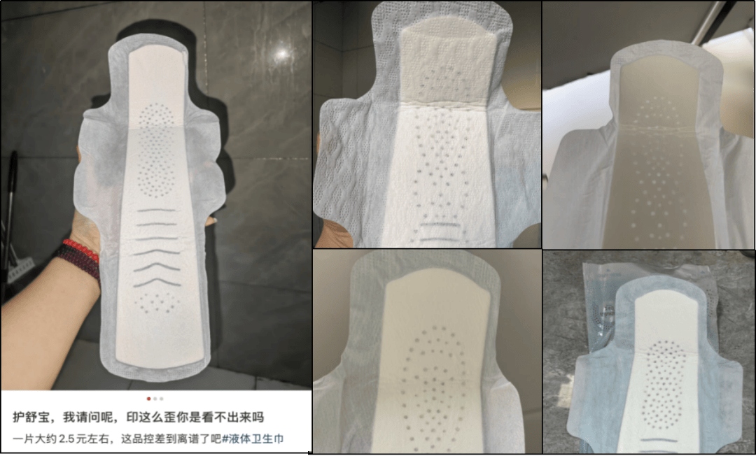 ▲消费者“晒出”吸收芯体不居中的液体卫生巾(图源:某社交平台)