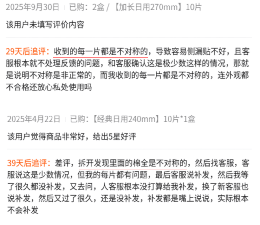 ▲消费者反映液体卫生巾不对称(图源:某电商平台官方旗舰店的产品评论区)
