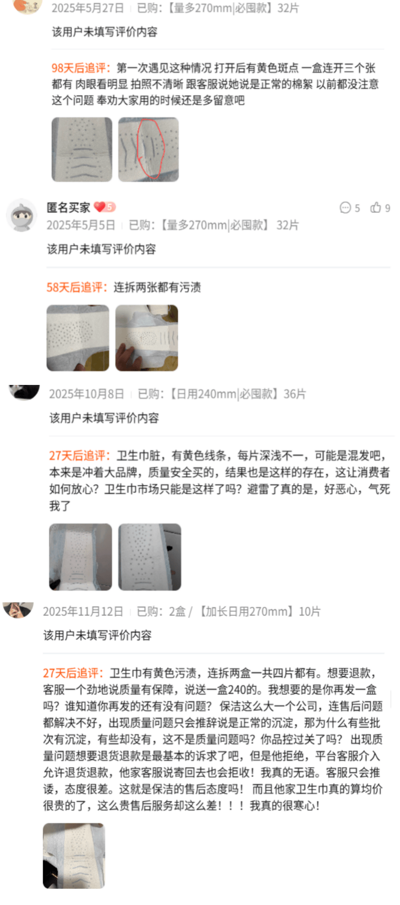 ▲消费者反映液体卫生巾有污渍(图源:某电商平台旗舰店的产品评论区)