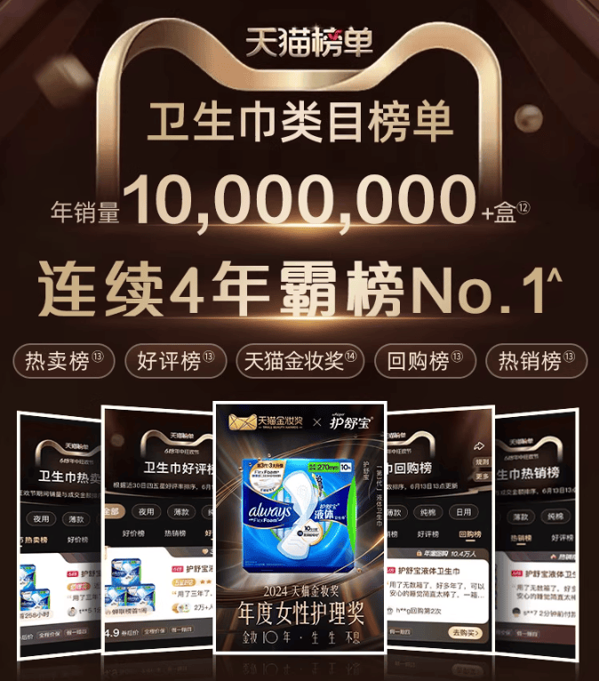 液体卫生巾是宝洁旗下知名品牌护舒宝推出的一款创新产品,于2015年进入中国市场,迅速成为宝洁的业绩增长引擎之一。一家电商平台的榜单显示,护舒宝液体卫生巾系列产品年销量1000万盒以上,并于2021-2024连续4年的618活动期间在卫生巾类目中支付金额排名第一。