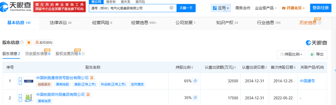 据天眼查,通号 (郑州) 电气化局集团有限公司成立于2001年,位于河南省郑州市,企业注册资本5亿元,法定代表人马玉忠。股东信息显示,中国铁路通信信号股份有限公司(中国通号)持股65%,中国铁路郑州局集团有限公司持股35%。主要从事铁路、城市轨道交通、 市政交通等领域的工程承包、系统集成、机电安装、运营维护、咨询服务等。
