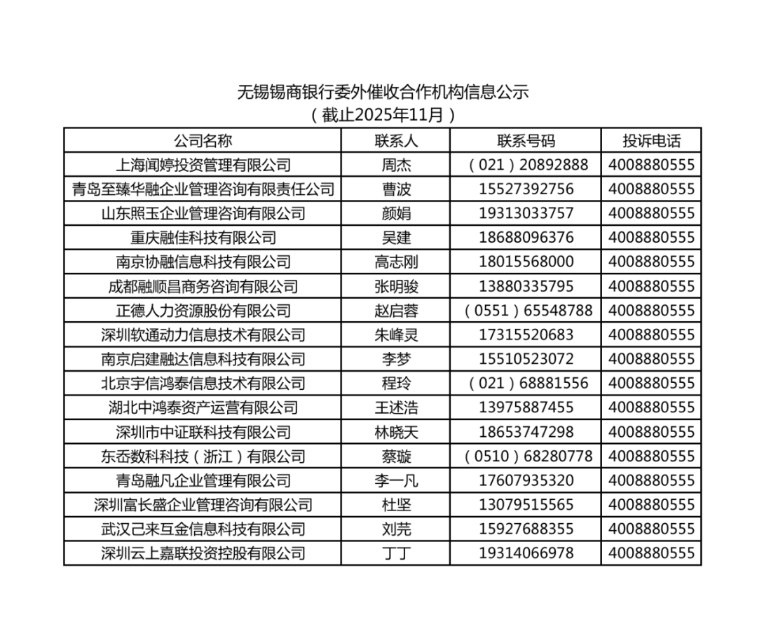 新苏商查阅锡商银行官网发现,南京启建融达为锡商银行长期合作的委外催收机构。此外,截至今年11月,锡商银行对外公布的委外催收合作机构已多达17家,与去年同期的10家相比,数量增加不少。